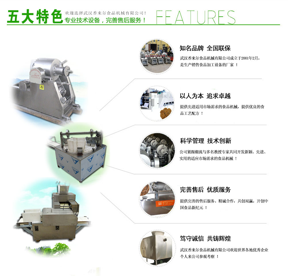 武漢香來(lái)爾食品機(jī)械有限公司成立于2001年2月,是生產(chǎn)銷(xiāo)售休閑食品加工設(shè)備的廠家。公司緊跟市場(chǎng)潮流與華工、華農(nóng)多名共同開(kāi)發(fā)新穎、實(shí)用的適應(yīng)市場(chǎng)需求的食品機(jī)械,自有車(chē)、刨、鉆、銑、剪板、折彎等先l進(jìn)機(jī)床100多臺(tái) 套。7年誠(chéng)信通會(huì)員,產(chǎn)品出口拉美、非洲、東南亞、歐洲等很多國(guó)家和地區(qū),國(guó)內(nèi)很多食品企業(yè)都是我們的合作伙伴。目前公司專門(mén)設(shè)立一個(gè)的售后 服務(wù)班子,在公司逐步發(fā)展強(qiáng)大的過(guò)程中,一直堅(jiān)持售后服務(wù)的同步發(fā)展,精良的食品設(shè)...